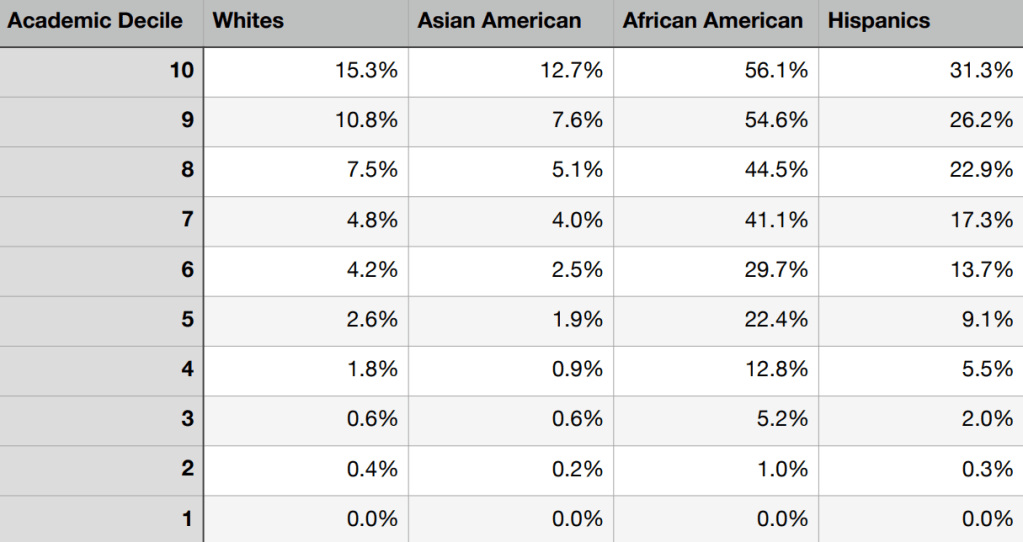 As visible above, an African American in the 5th academic decile, for example, would have a 20.5% more chance of getting into Harvard than an Asian American in the same academic decile. I believe that this, obviously, is absolutely discriminatory. Why should someone who worked as hard, or maybe even harder than someone else be denied solely on their race? I believe that the Supreme Court in their ruling of Grutter v. Bollinger were mistaken in their argument that anyone who is accepted or rejected would not have been mainly for their race.
