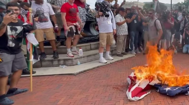 This is in the capital of the nation, Washington DC. This is also an American flag being burned by a group of terrorist sympathizers chanting “Allahu Akbar” and expletives.